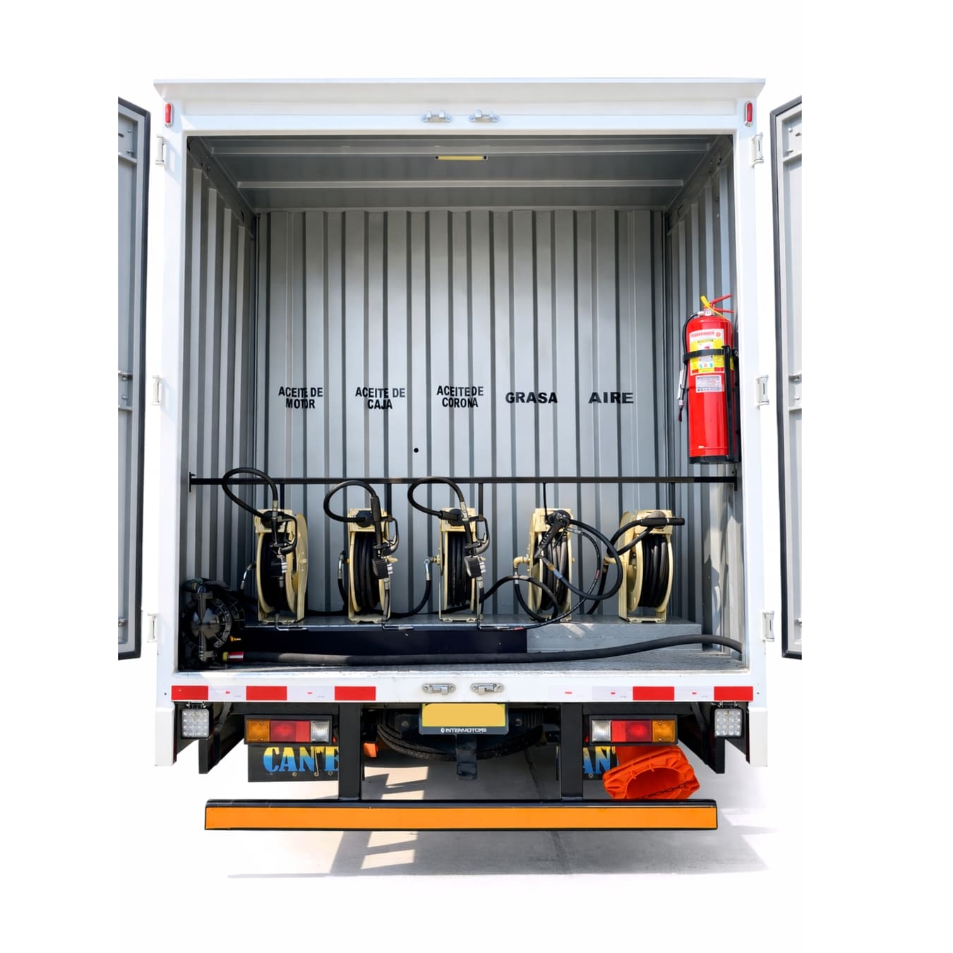 Cuenta con sistema de bombeo neumático, carretos retráctiles con mangueras de 15 metros, cilindros independientes para aceite de motor, transmisión, hidráulico, grasa y tanque para aceite de reciclaje.